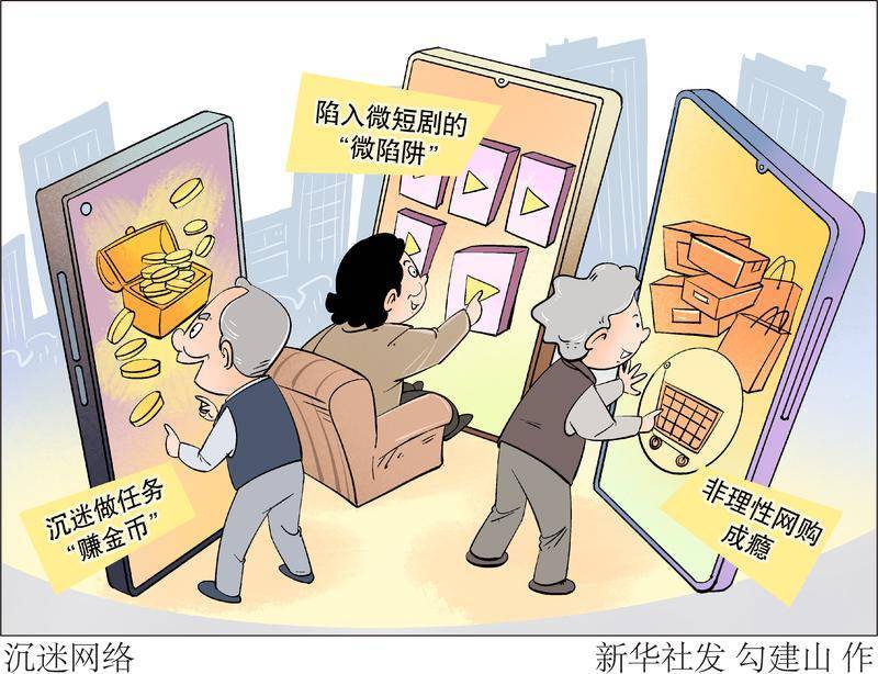 新华社图表,北京,2025年2月24日 最近,许多网友在社交平台上的“网瘾老人”话题中认领起“同款爸妈”:有的沉迷“赚金币”,上网8小时赚回2元钱;有的茶饭不思,刷短视频、看微短剧、听小说直至深夜;还有的不信儿女信主播,跟风下单各种劣质保健品…… 在良莠不齐的电子信息“围猎”下,老年人“触网”背后既有精彩也有陷阱。 新华社发 勾建山 作