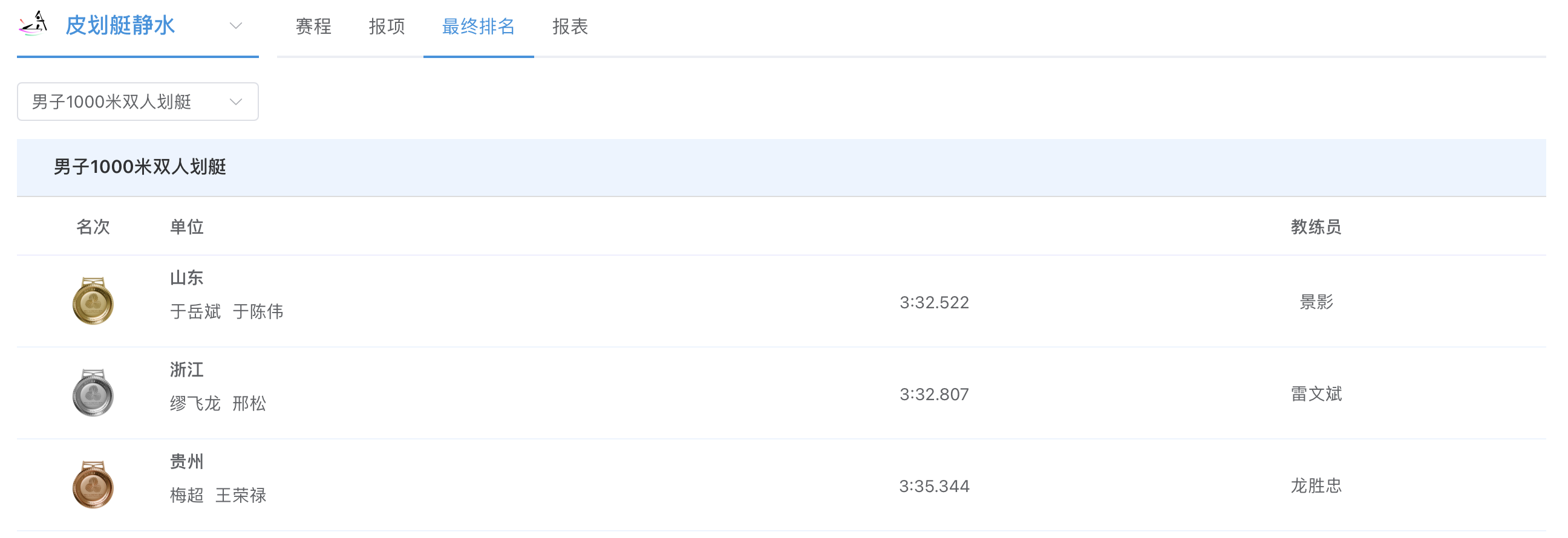 本场决赛,于岳斌/于陈伟从第5航道出发,最终以3分32秒522的成绩完赛,成功夺得金牌。浙江组合缪飞龙/邢松3分32秒807获得亚军,贵州组合梅超/王荣禄3分35秒344获得季军。