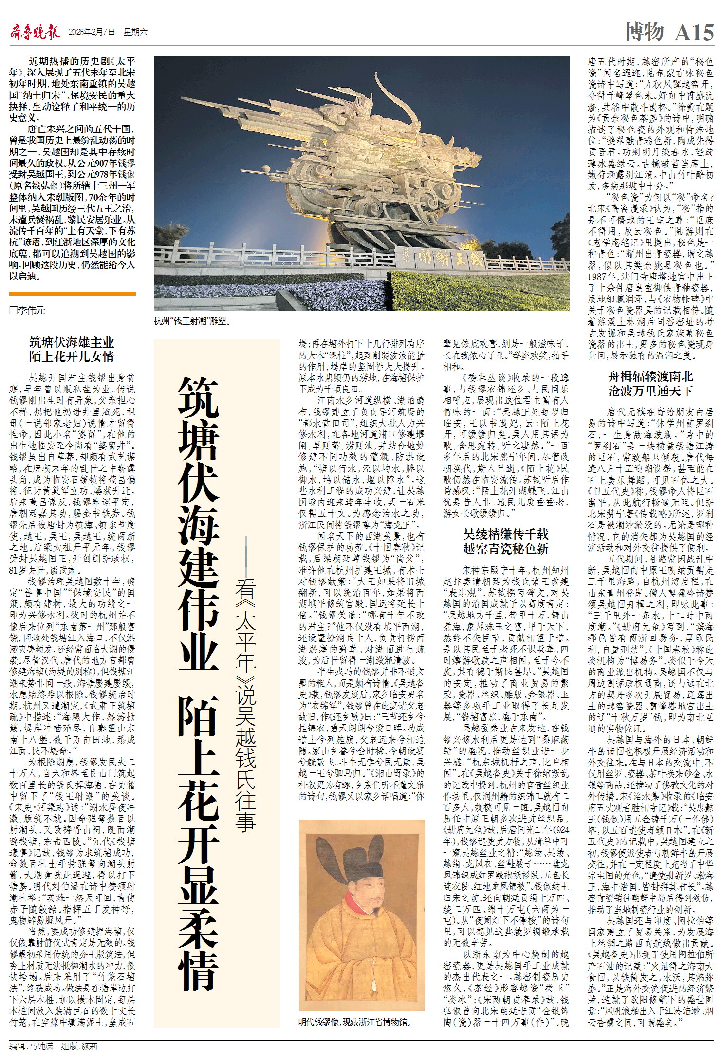 唐亡宋兴之间的五代十国,曾是我国历史上最纷乱动荡的时期之一,吴越国却是其中存续时间最久的政权。从公元907年钱镠受封吴越国王,到公元978年钱俶(原名钱弘俶)将所辖十三州一军整体纳入宋朝版图,70余年的时间里,吴越国历经三代五王之治,未遭兵燹祸乱,黎民安居乐业。从流传千百年的“上有天堂,下有苏杭”谚语,到江浙地区深厚的文化底蕴,都可以追溯到吴越国的影响。回顾这段历史,仍然能给今人以启迪。