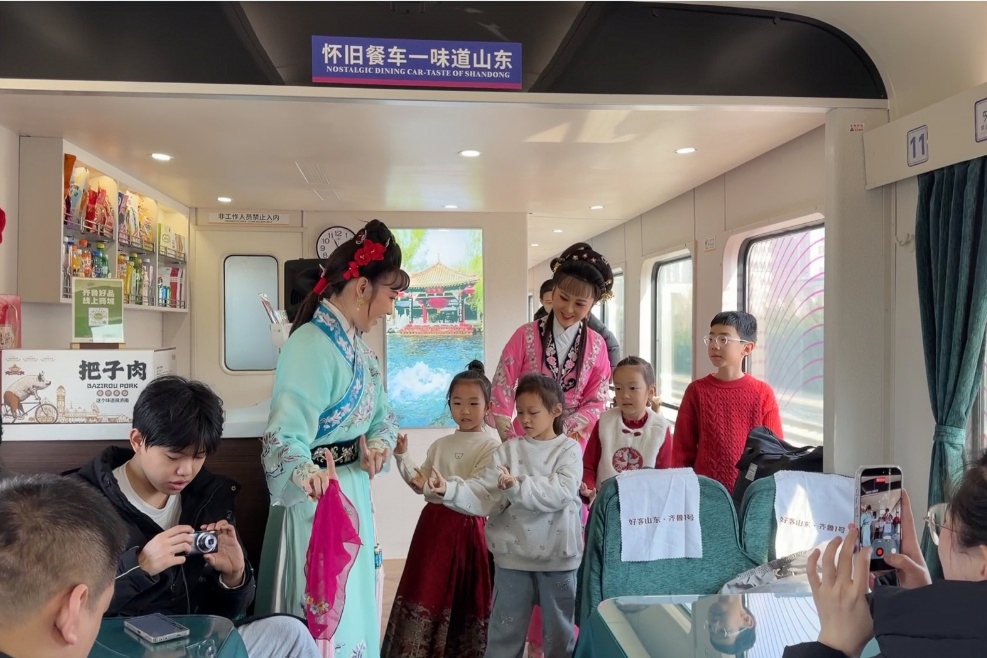 近日,山东省吕剧院的演员登上“好客山东·齐鲁1号”旅游列车,以彩唱的形式为旅客献上吕剧表演,现场互动热烈。