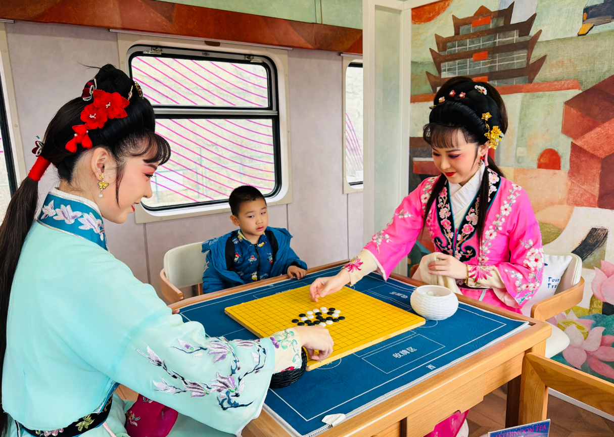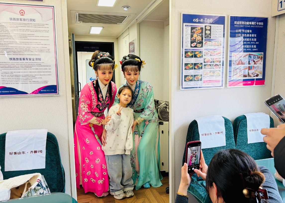 此次演出带队负责人、山东省吕剧院张雪妮坦言,这种“文旅+非遗”的流动传播,比剧场更接地气、更有穿透力,“看到乘客驻足、拍照、学习戏曲程式化表演,觉得所有准备都值了,这就是非遗活态传承最生动的样子。”